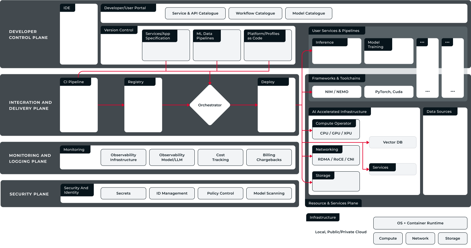 The AI-empowered Internal Developer Platform (IDP) architecture from Bechtle Competence Center AV Software Solutions 360° (AVS), developed in collaboration with NVIDIA and Dell, is designed to support machine learning (ML) development and deployment, particularly in industries with strict security and compliance requirements. AVS’s new architecture advances traditional platform engineering by integrating AI-centric features across three distinct planes: